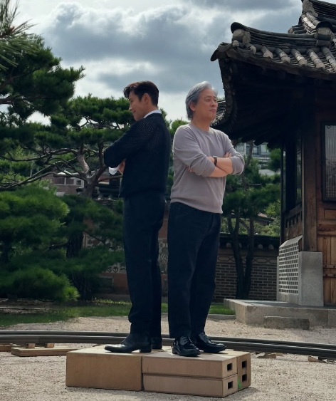 사진과 영상 속 이병헌은 박찬욱 감독과 등을 맞대고 서 있다. 두 사람은 팔짱을 끼는가 하면 주머니에 손을 넣는 등 카리스마를 바출했다.