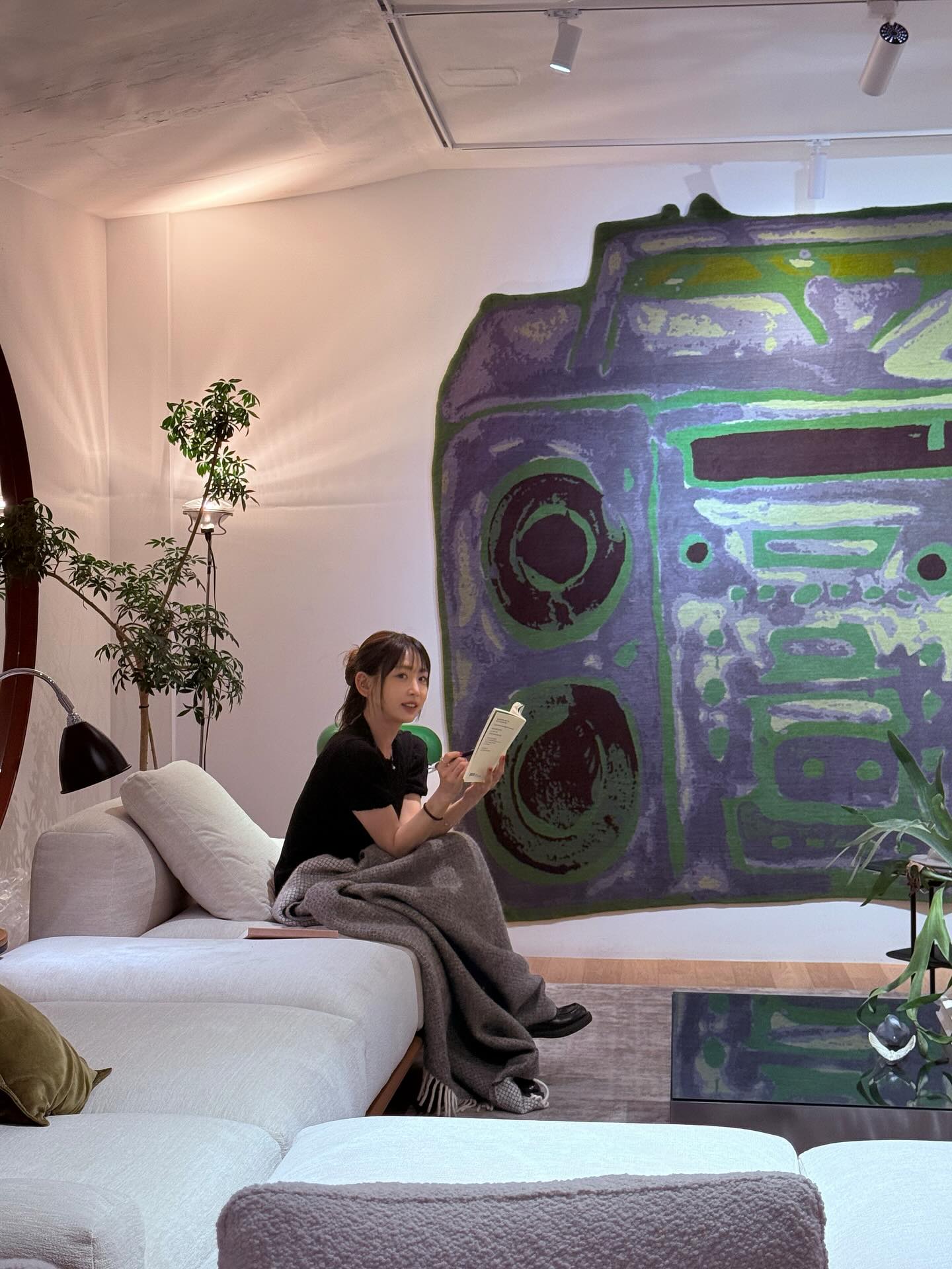 이어진 사진에서는 거대한 그림 장식이 걸린 벽을 배경으로 소파에 앉아 책을 읽다 카메라를 응시하면서 여유로운 분위기를 연출하고 있다.