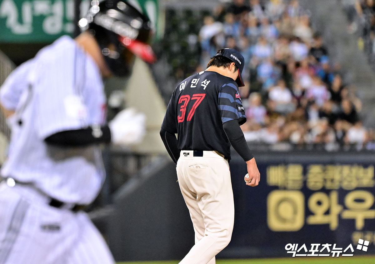 (엑스포츠뉴스 잠실, 김한준 기자) 21일 오후 서울 송파구 잠실야구장에서 열린 '2025 신한 SOL Bank KBO리그' 롯데 자이언츠와 LG 트윈스의 경기, 6회말 무사 1,2루 롯데 이민석이 LG 김현수에게 볼넷을 허용한 후 아쉬워하고 있다.