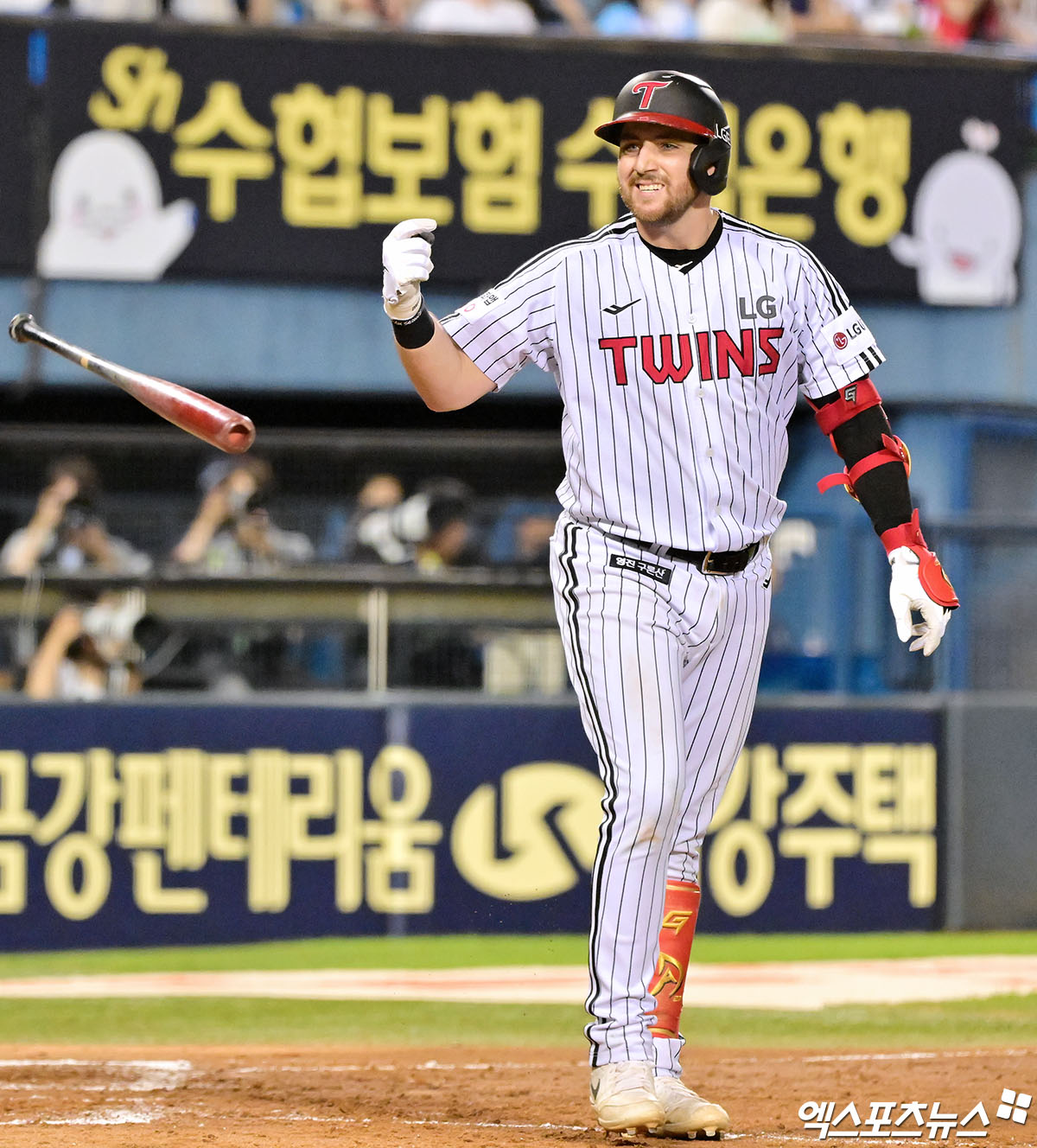 (엑스포츠뉴스 잠실, 김한준 기자) 21일 오후 서울 송파구 잠실야구장에서 열린 '2025 신한 SOL Bank KBO리그' 롯데 자이언츠와 LG 트윈스의 경기, 7회말 LG 오스틴이 솔로 홈런을 날리고 있다.