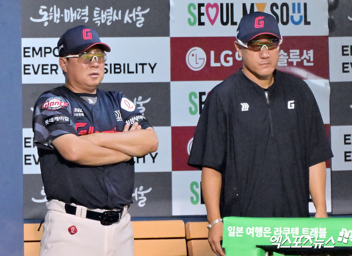 (엑스포츠뉴스 잠실, 김한준 기자) 21일 오후 서울 송파구 잠실야구장에서 열린 '2025 신한 SOL Bank KBO리그' 롯데 자이언츠와 LG 트윈스의 경기, 롯데 김태형 감독과 조원우 수석코치가 경기를 지켜보고 있다.