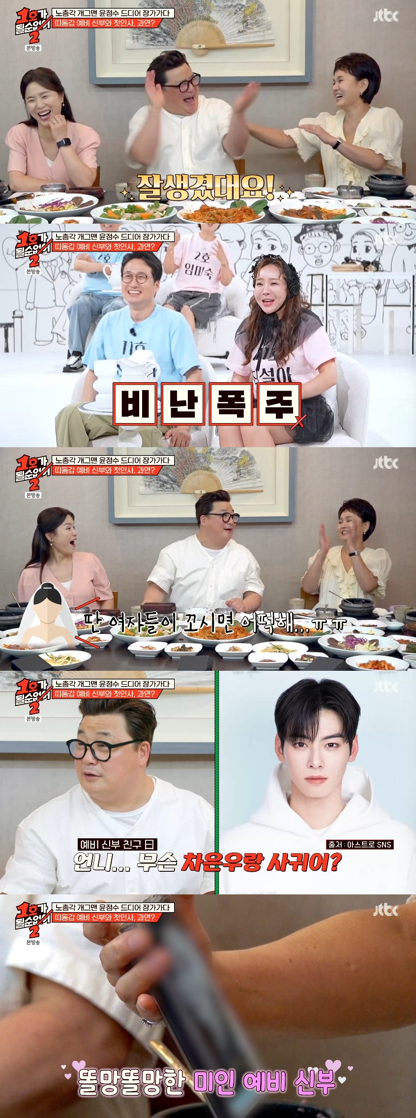 놀란 선배들 반응 속 윤정수는 예비 신부가 그의 친구에게 여러 자랑을 늘어 놓으며 다른 여성들이 접근할까 걱정되는 마음을 토로, 이에 친구는 "무슨 차은우 사귀냐"라고 말한 사실이 전해져 후끈한 반응이 이어졌다.