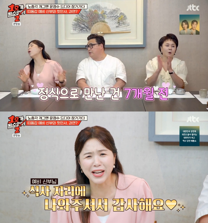 당황한 윤정수는 "예, 초혼"이라고 답했고, 최양락은 "옛날에도 결혼한다고 몇 년 동안 사귀고 그랬지 않냐"면서 가상 부부로 케미를 뽐냈던 김숙을 언급했다.