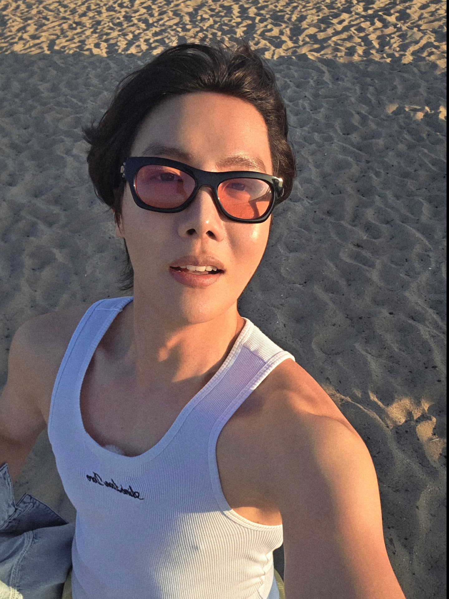 공개된 사진 속 제이홉은 BTS 멤버들과 함께 해변가를 바탕으로 서서 포즈를 취하고 있다.