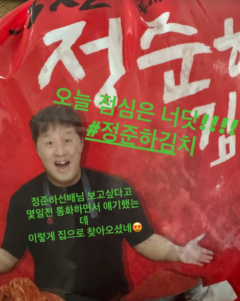 공개된 사진에는 정준하가 만들어 사업 중인 김치 포장지가 담겨 있으며, 정준하의 얼굴이 반가움을 자아낸다.
