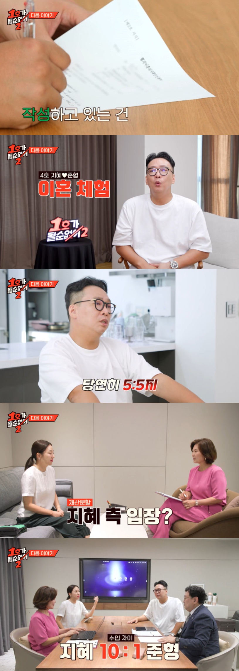 두 사람은 재산 분할까지 의논했고, 박준형은 "딱 반으로 가르는 거냐"는 김지혜의 말에 "당연히 5대 5지. 딱 반반하면 된다"라고 답했다.