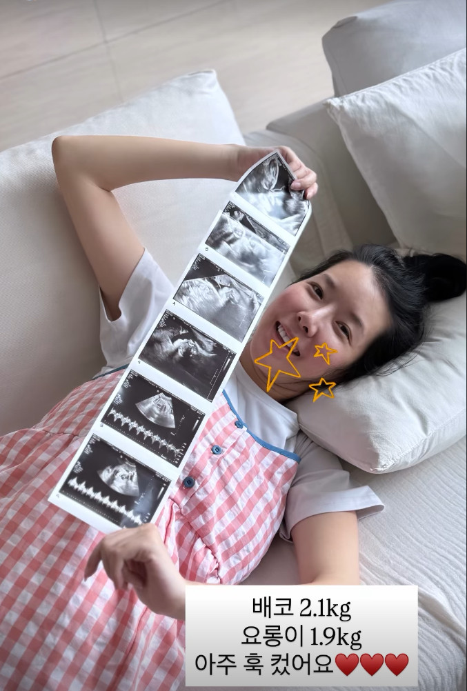 사진 속에는 임신 33주 차 초음파 사진을 들고 환하게 웃고 있는 김지혜의 모습이 담겨 있다. 건강하게 무럭무럭 자라고 있는 쌍둥이들의 근황에 행복해하는 표정이다.