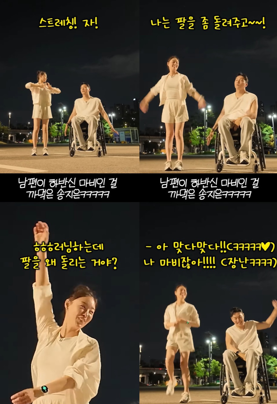21일 박위는 자신의 계정에 "부부가 스트레칭하는 법", "남편이 하반신 마비인 걸 까먹은 송지은"이라는 제목의 영상을 올렸다.