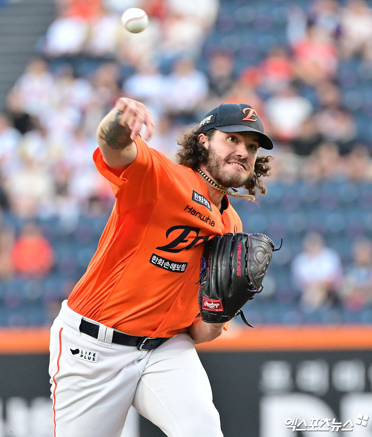 (엑스포츠뉴스 대전, 김한준 기자) 22일 오후 대전 한화생명 볼파크에서 열린 '2025 신한 SOL Bank KBO리그' SSG 랜더스와 한화 이글스의 경기, 1회초 한화 선발투수 폰세가 공을 힘차게 던지고 있다.
