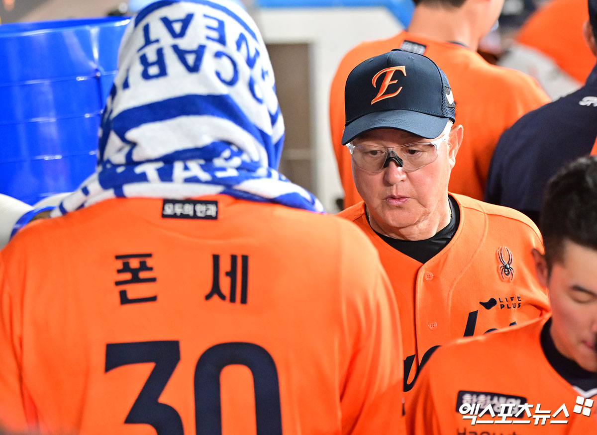 (엑스포츠뉴스 대전, 김한준 기자) 22일 오후 대전 한화생명 볼파크에서 열린 '2025 신한 SOL Bank KBO리그' SSG 랜더스와 한화 이글스의 경기, 7회초 수비를 마친 한화 폰세가 김경문 감독의 격려를 받고 있다.