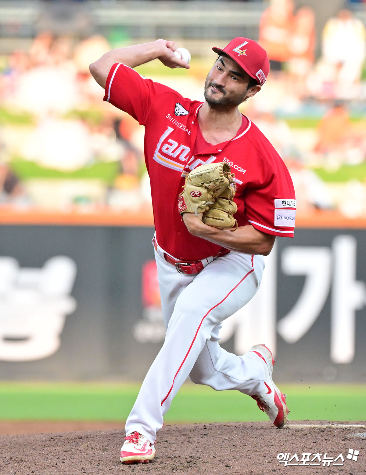 (엑스포츠뉴스 대전, 김한준 기자) 23일 오후 대전 한화생명 볼파크에서 열린 '2025 신한 SOL Bank KBO리그' SSG 랜더스와 한화 이글스의 경기, 1회말 SSG 선발투수 화이트가 공을 힘차게 던지고 있다.