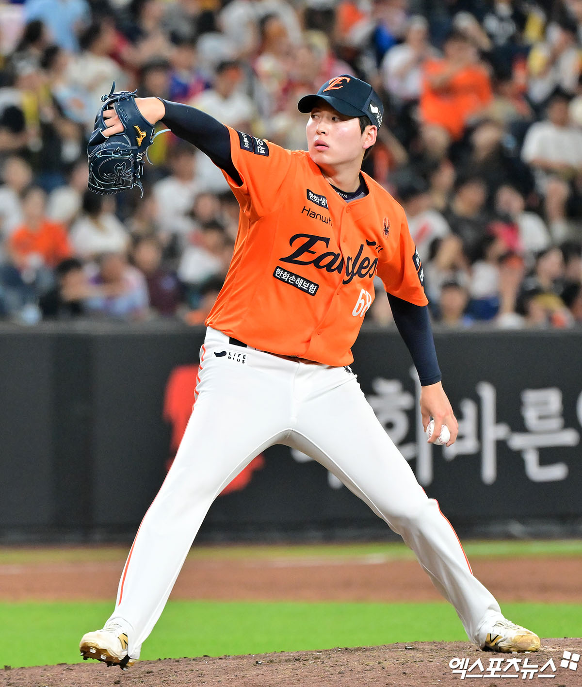 (엑스포츠뉴스 대전, 김한준 기자) 23일 오후 대전 한화생명 볼파크에서 열린 '2025 신한 SOL Bank KBO리그' SSG 랜더스와 한화 이글스의 경기, 9회초 2사 1,2루 한화 조동욱이 공을 힘차게 던지고 있다.