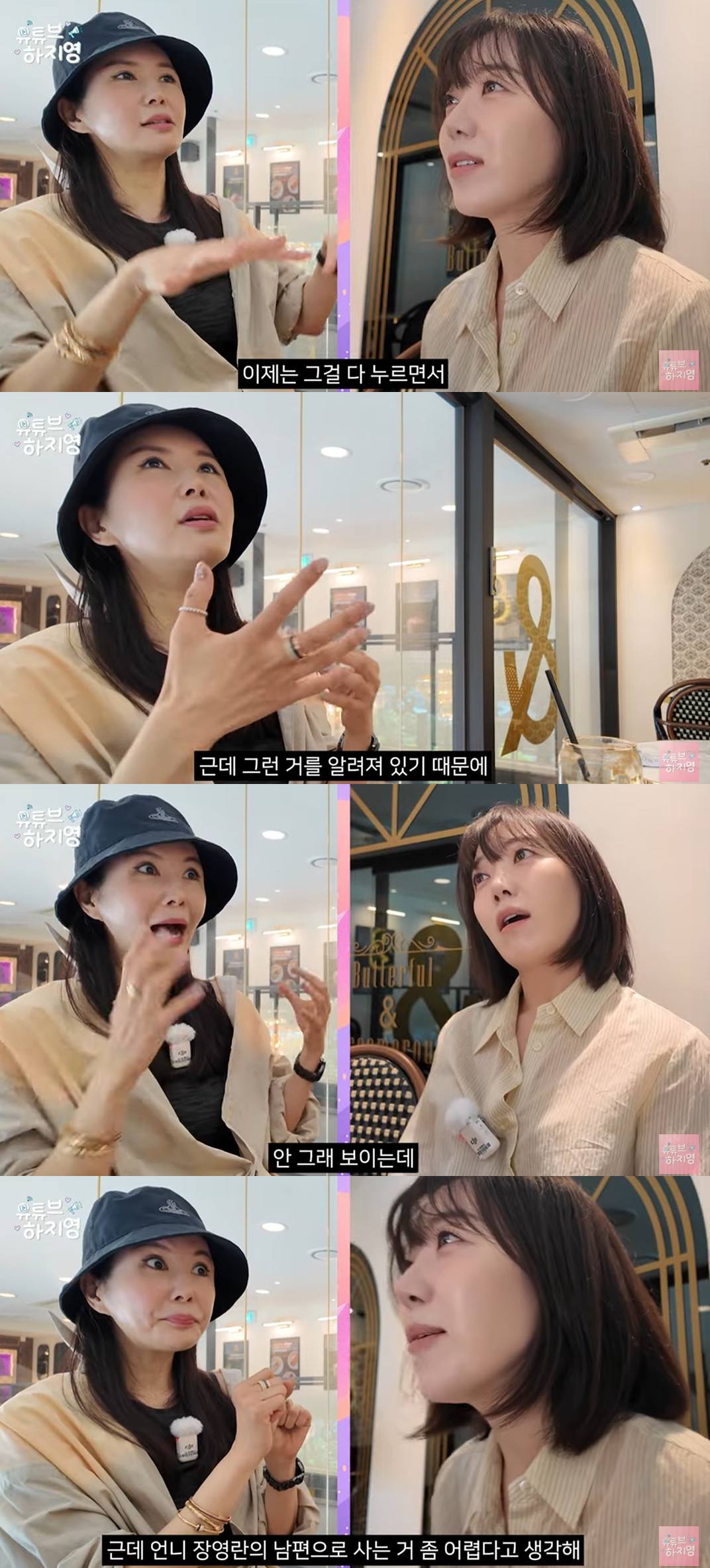 하지영은 "장영란의 남편으로 사는게 어렵다고 생각한다. 장영란 때문에 모든 것을 못하지않냐"고 말했다.