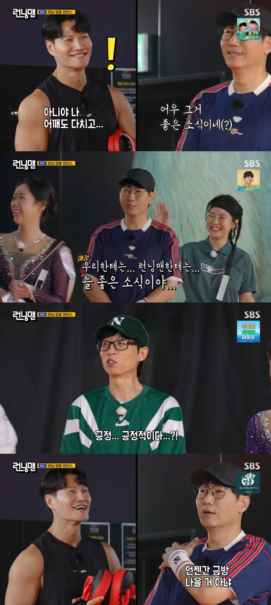 김종국은 "아니다. 나 어깨도 다치고 부상 이슈가 있다"라며 어깨 부상 소식을 전해 눈길을 끌었다. 이에 지석진은 "그거 좋은 소식이네. 우리한테는, 런닝맨한테는 늘 좋은 소식이야"라며 김종국의 부상 소식을 기뻐하는 모습을 보여 웃음을 유발했다.
