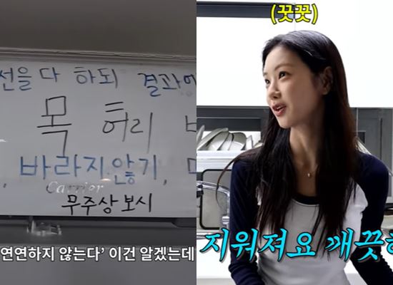 에어컨에는 '등 펴. 목 허리 바르게', '받아들이기, 바라지 않기, 매일 하기', '무주상보시', '최선을 다하되 결과에 연연하지 않는다' 등이 적혀 있었다. 이세희는 "자세가 곧게 서 있으면 생각도 곧게 서게 된다"면서도 "뼈가 좀 안 좋긴 하다"고 말해 눈길을 끌었다.