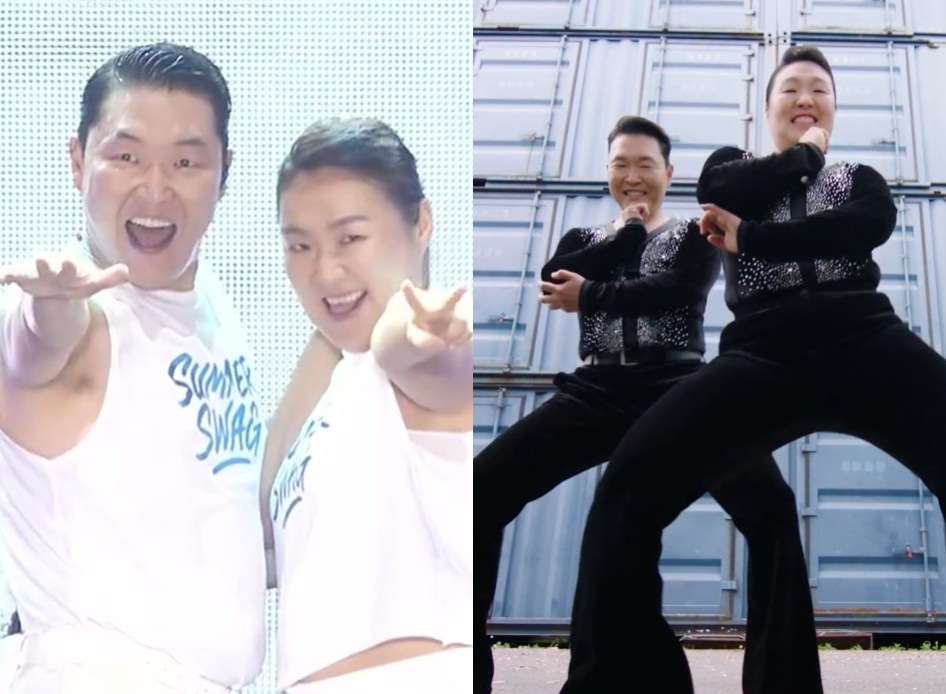공개된 영상에는 싸이와 커플룩을 맞춰입은 채 함께 춤을 추고 있는 이수지의 모습이 담겼다. 이수지는 싸이와 연예계 대표 '도플갱어'답게 쌍둥이 같은 외모를 과시해 웃음을 자아냈다.