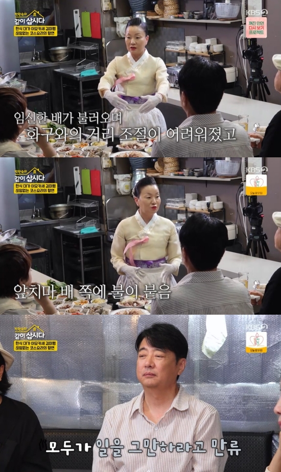 김미령은 "왜냐하면 배에 불이 붙었다. 불이 확 올라오는 곳에서 국수를 삶는데 배가 나와 거리가 멀어지니까 가까이 가다가 앞치마에 불이 붙었다. 오죽하면 주변에서 손님들이 제발 그만 나오라고 했다. 그렇지만 낳는 날까지 끝까지 일을 했다"고 말했다.