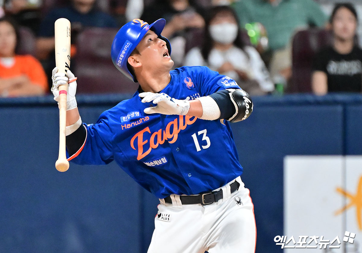 (엑스포츠뉴스 고척, 김한준 기자) 26일 오후 서울 구로구 고척스카이돔에서 열린 '2025 신한 SOL Bank KBO리그' 한화 이글스와 키움 히어로즈의 경기, 5회초 무사 1,2루 한화 최재훈이 번트를 시도하고 있다.