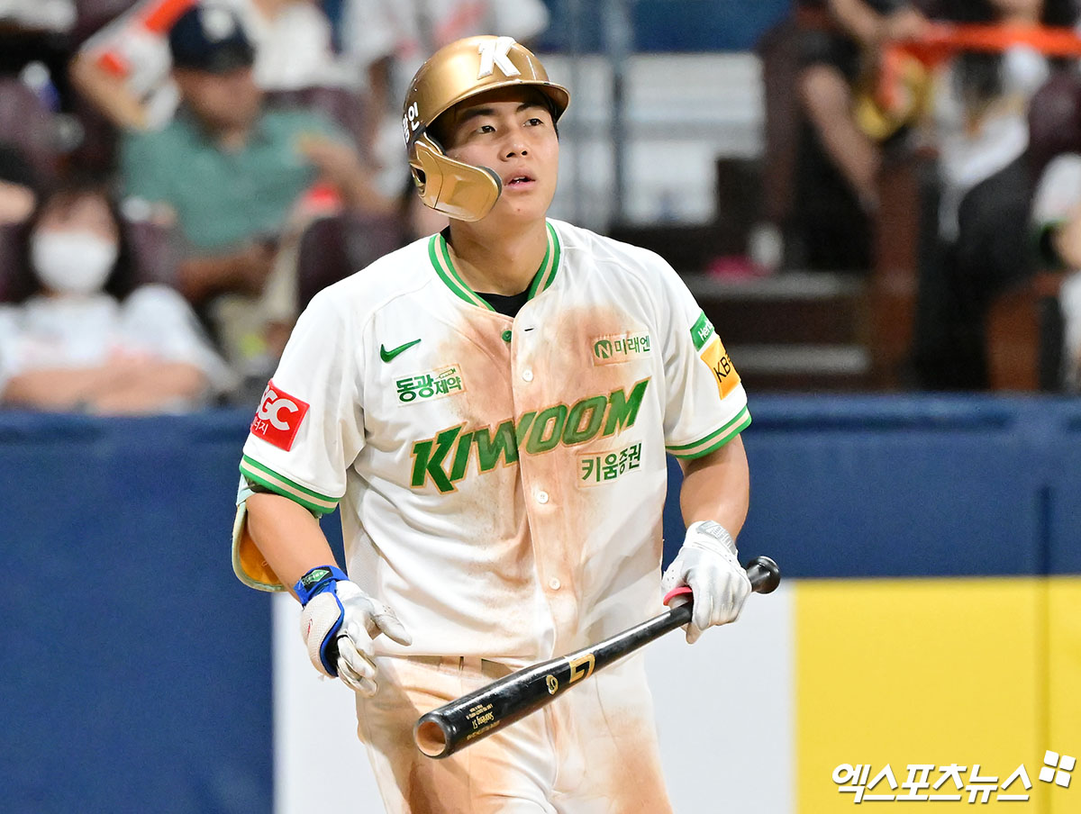 (엑스포츠뉴스 고척, 김한준 기자) 26일 오후 서울 구로구 고척스카이돔에서 열린 '2025 신한 SOL Bank KBO리그' 한화 이글스와 키움 히어로즈의 경기, 7회말 2사 키움 어준서가 볼넷으로 출루하고 있다.