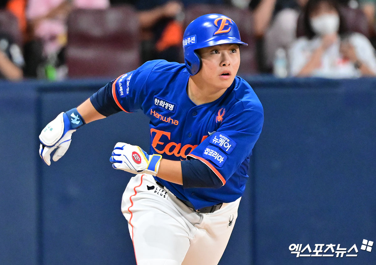 (엑스포츠뉴스 고척, 김한준 기자) 26일 오후 서울 구로구 고척스카이돔에서 열린 '2025 신한 SOL Bank KBO리그' 한화 이글스와 키움 히어로즈의 경기, 9회초 한화 문현빈이 솔로 홈런을 날리고 있다.