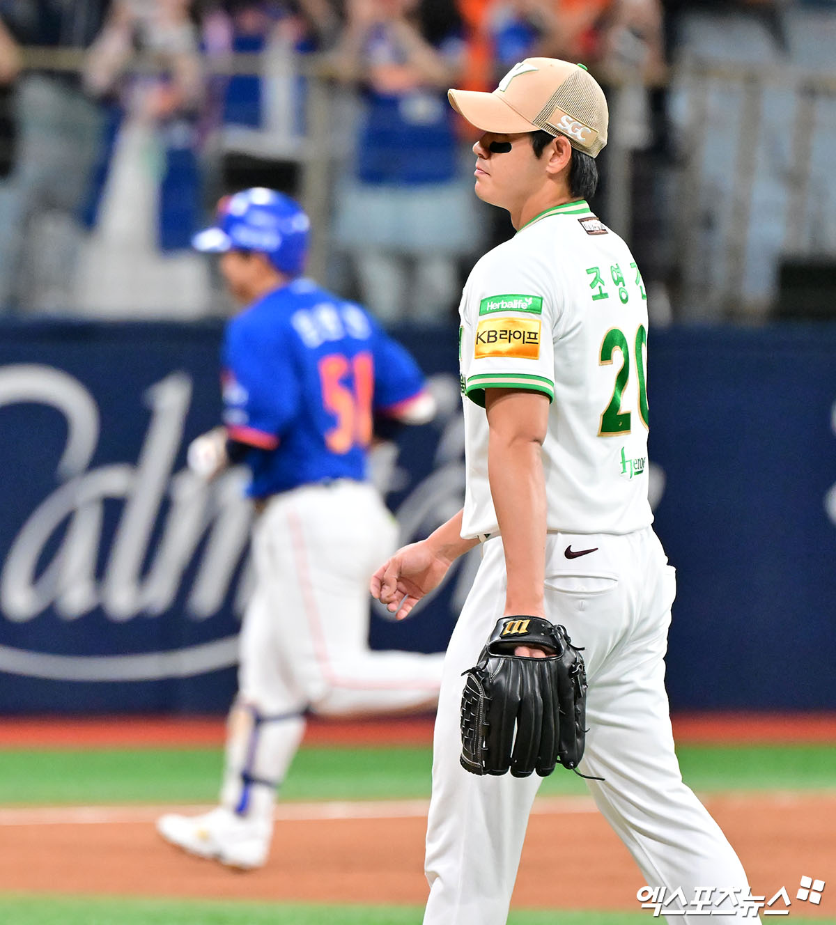 (엑스포츠뉴스 고척, 김한준 기자) 26일 오후 서울 구로구 고척스카이돔에서 열린 '2025 신한 SOL Bank KBO리그' 한화 이글스와 키움 히어로즈의 경기, 9회초 키움 조영건이 한화 문현빈에게 솔로 홈런을 허용한 후 아쉬워하고 있다.