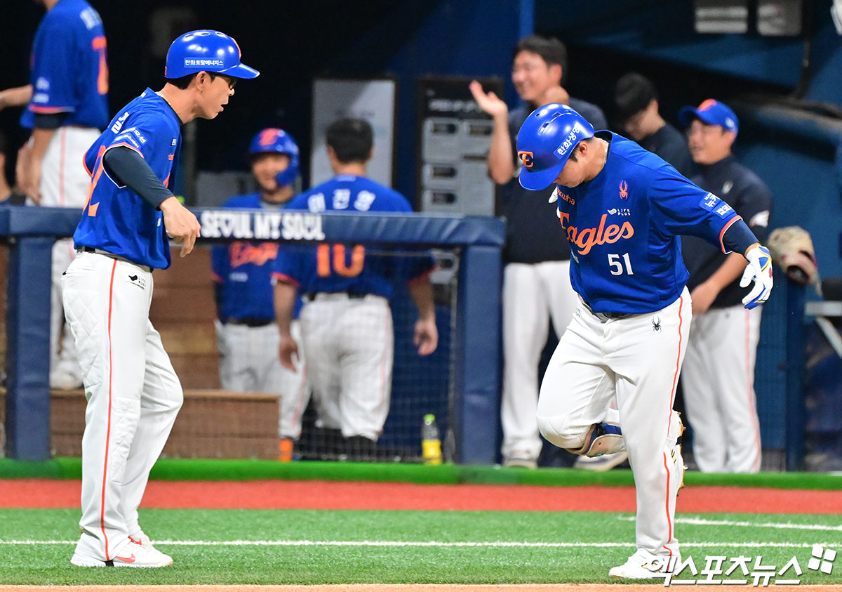 (엑스포츠뉴스 고척, 김한준 기자) 26일 오후 서울 구로구 고척스카이돔에서 열린 '2025 신한 SOL Bank KBO리그' 한화 이글스와 키움 히어로즈의 경기, 9회초 한화 문현빈이 솔로 홈런을 날린 후 기뻐하고 있다.