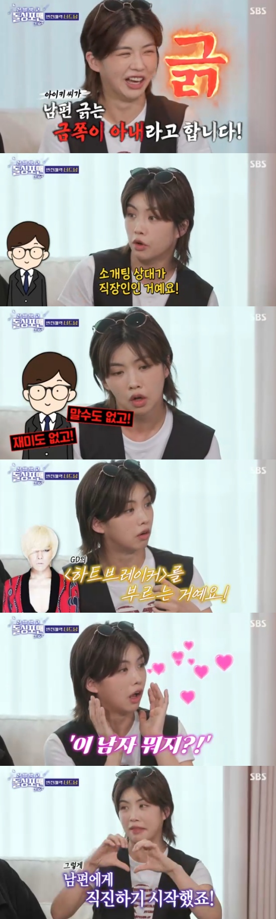 이어 "카페에서 만났는데 말도 없고 재미도 없더라. 그래서 2차로 소개시켜준 커플하고 넷이서 노래방을 갔다. 근데 갑자기 조용했던 남편이 GD의 '하트브레이커'를 부르더라. 그런데 나쁘지 않았다. 그 모습이 반전이었다"면서 웃었다.