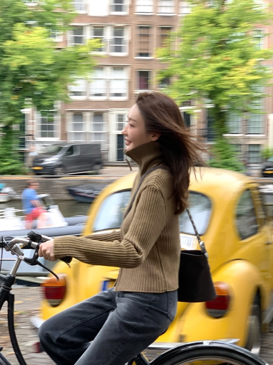 강민경은 26일 자신의 계정에 사진을 게시했다. 네덜란드 암스테르담의 거리에서 자전거를 탄 강민경의 모습은 마치 '가을 여신' 같다.
