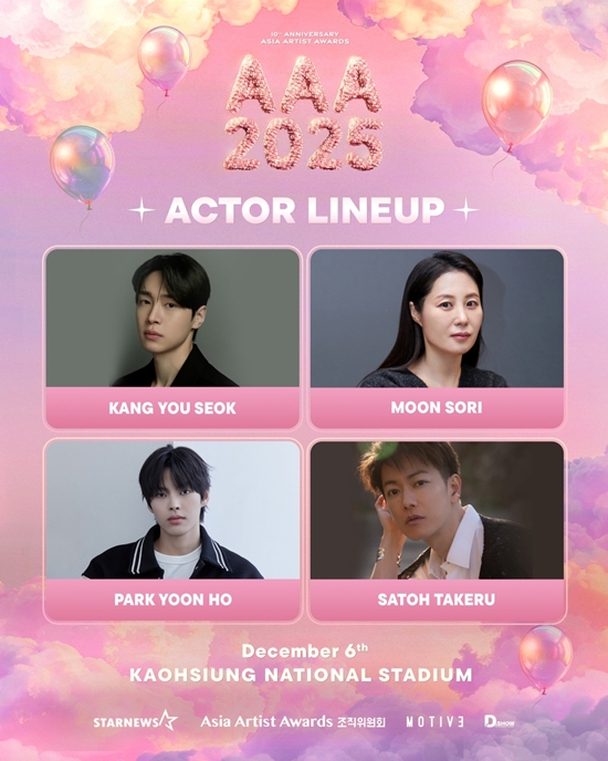 오는 12월 6일 가오슝 내셔널 스타디움에서 펼쳐지는 ‘10주년 아시아 아티스트 어워즈 2025(10th Anniversary Asia Artist Awards 2025, 이하 ‘10주년 AAA 2025’)’에 배우 강유석, 문소리, 박윤호, 사토 타케루, 엄지원, 이준혁, 최대훈, 추영우(가나다 순)가 출연을 확정 지었다.