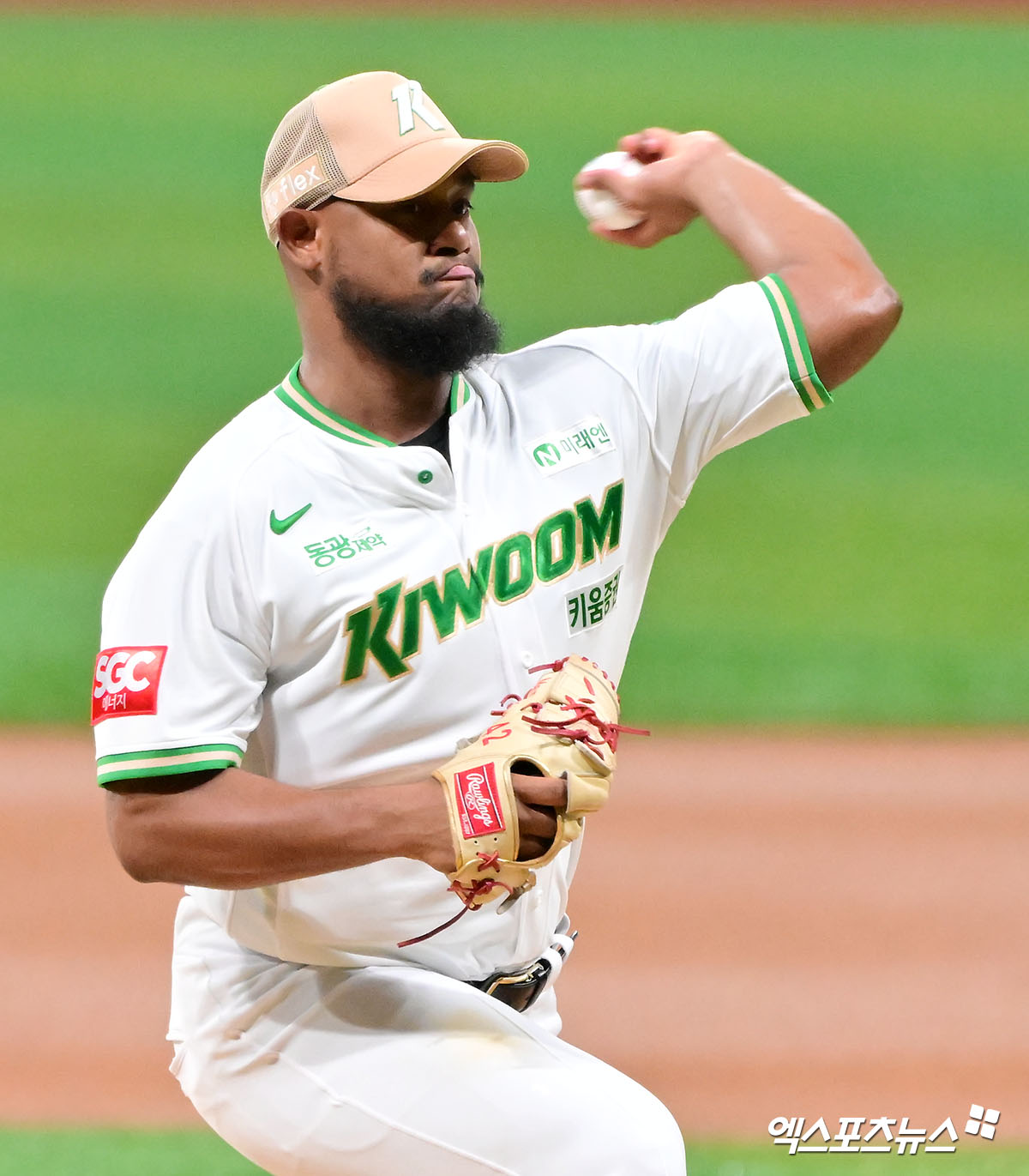 (엑스포츠뉴스 고척, 김한준 기자) 27일 오후 서울 구로구 고척스카이돔에서 열린 '2025 신한 SOL Bank KBO리그' 한화 이글스와 키움 히어로즈의 경기, 1회초 키움 선발투수 메르세데스가 공을 힘차게 던지고 있다.