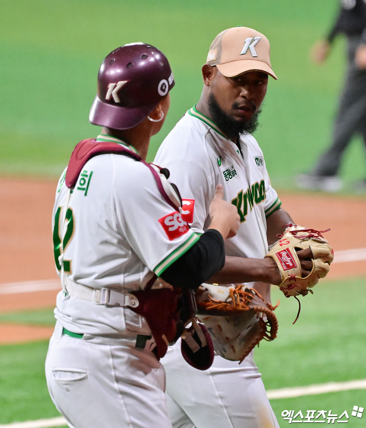 (엑스포츠뉴스 고척, 김한준 기자) 27일 오후 서울 구로구 고척스카이돔에서 열린 '2025 신한 SOL Bank KBO리그' 한화 이글스와 키움 히어로즈의 경기, 1회초 수비를 마친 키움 선발투수 메르세데스가 더그아웃으로 향하고 있다.