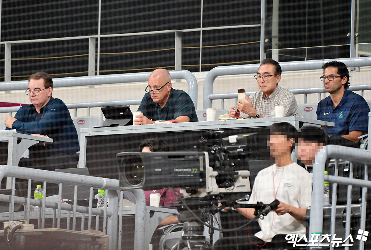 (엑스포츠뉴스 고척, 김한준 기자) 27일 오후 서울 구로구 고척스카이돔에서 열린 '2025 신한 SOL Bank KBO리그' 한화 이글스와 키움 히어로즈의 경기, 메이저리그 스카우터들이 경기를 지켜보고 있다.