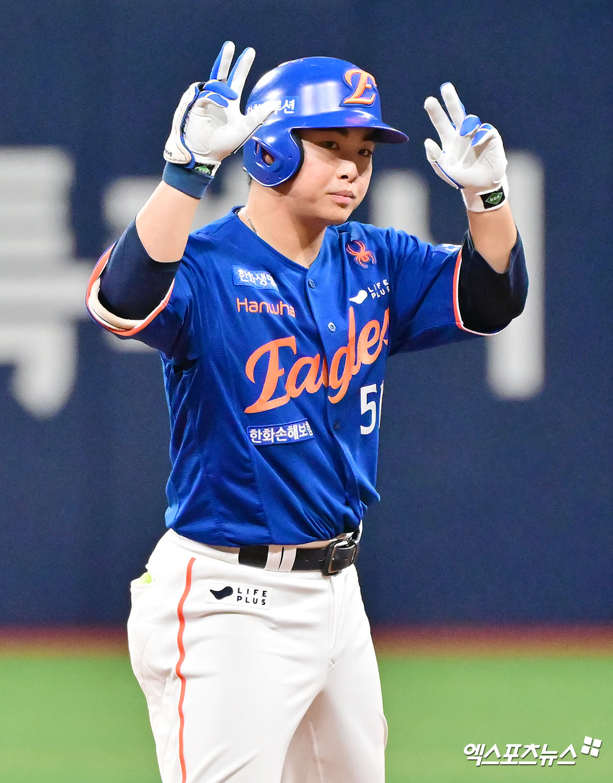 (엑스포츠뉴스 고척, 김한준 기자) 27일 오후 서울 구로구 고척스카이돔에서 열린 '2025 신한 SOL Bank KBO리그' 한화 이글스와 키움 히어로즈의 경기, 8회초 1사 1루 한화 문현빈이 1타점 2루타를 날리고 있다.