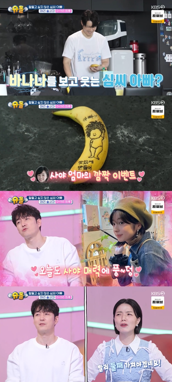 이날 방송에서 심형탁이 하루에게 줄 바나나를 살펴보던 중 미소를 지었다. 심형탁의 아내 사야가 바나나에 귀여운 메시지와 함께 하루를 그려 놓은 것. 심형탁은 "어떻게 안 사랑할 수 있어"라며 아내를 향한 싱쿵멘트를 던졌다.