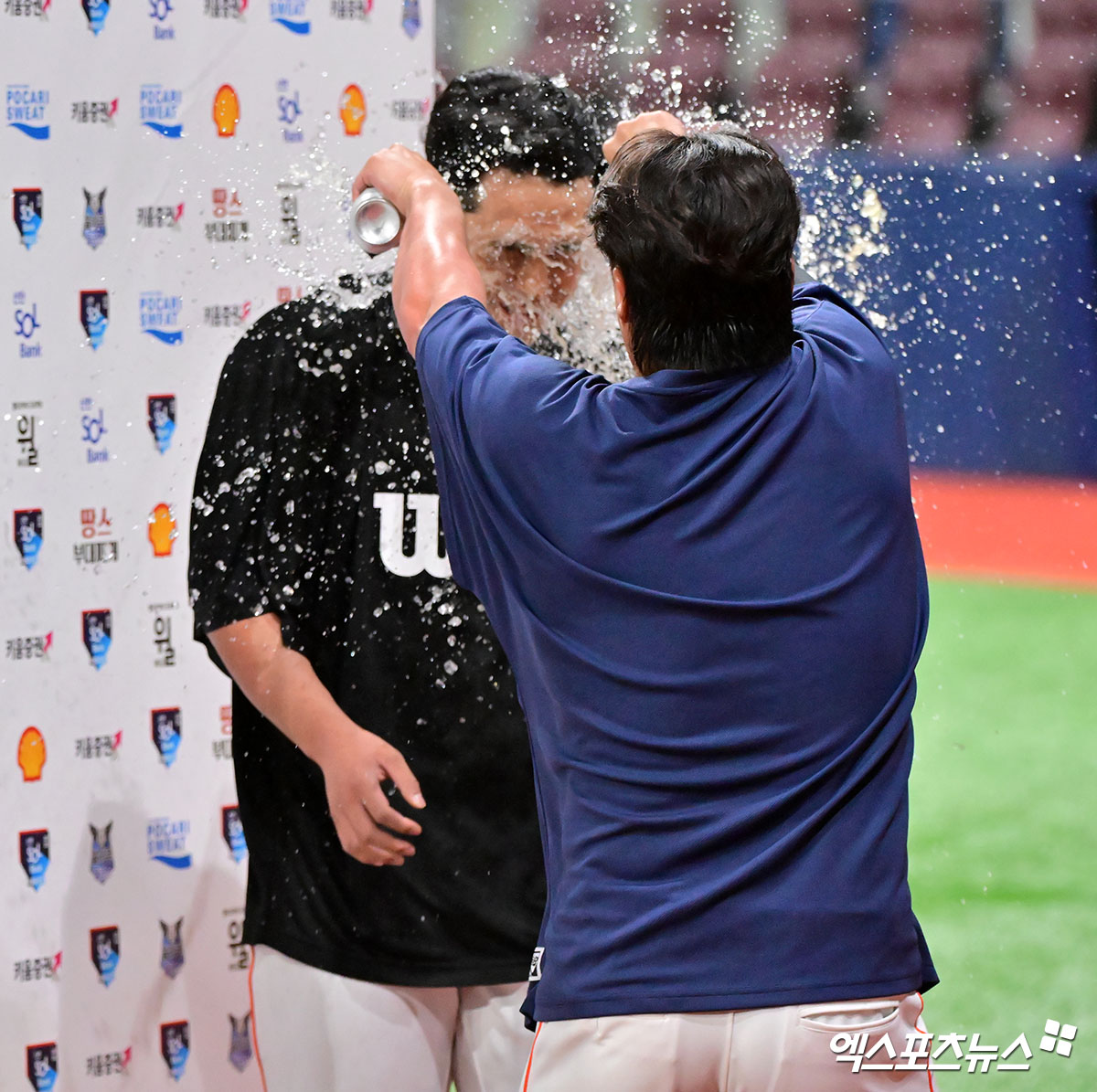 데뷔 첫 10승을 거둔 한화 문동주가 축하 물세례를 맞고 있다.