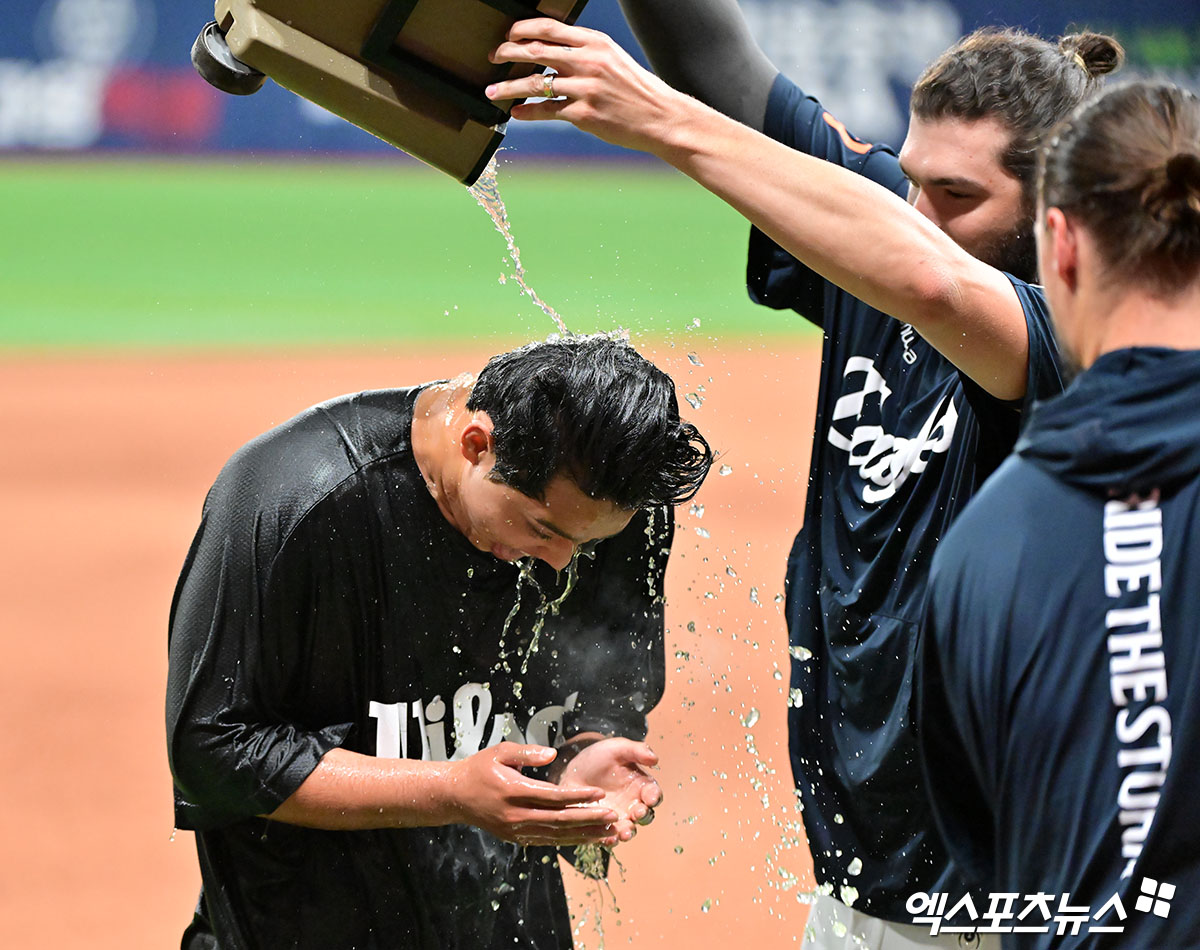 데뷔 첫 10승을 거둔 한화 문동주가 축하 물세례를 맞고 있다.