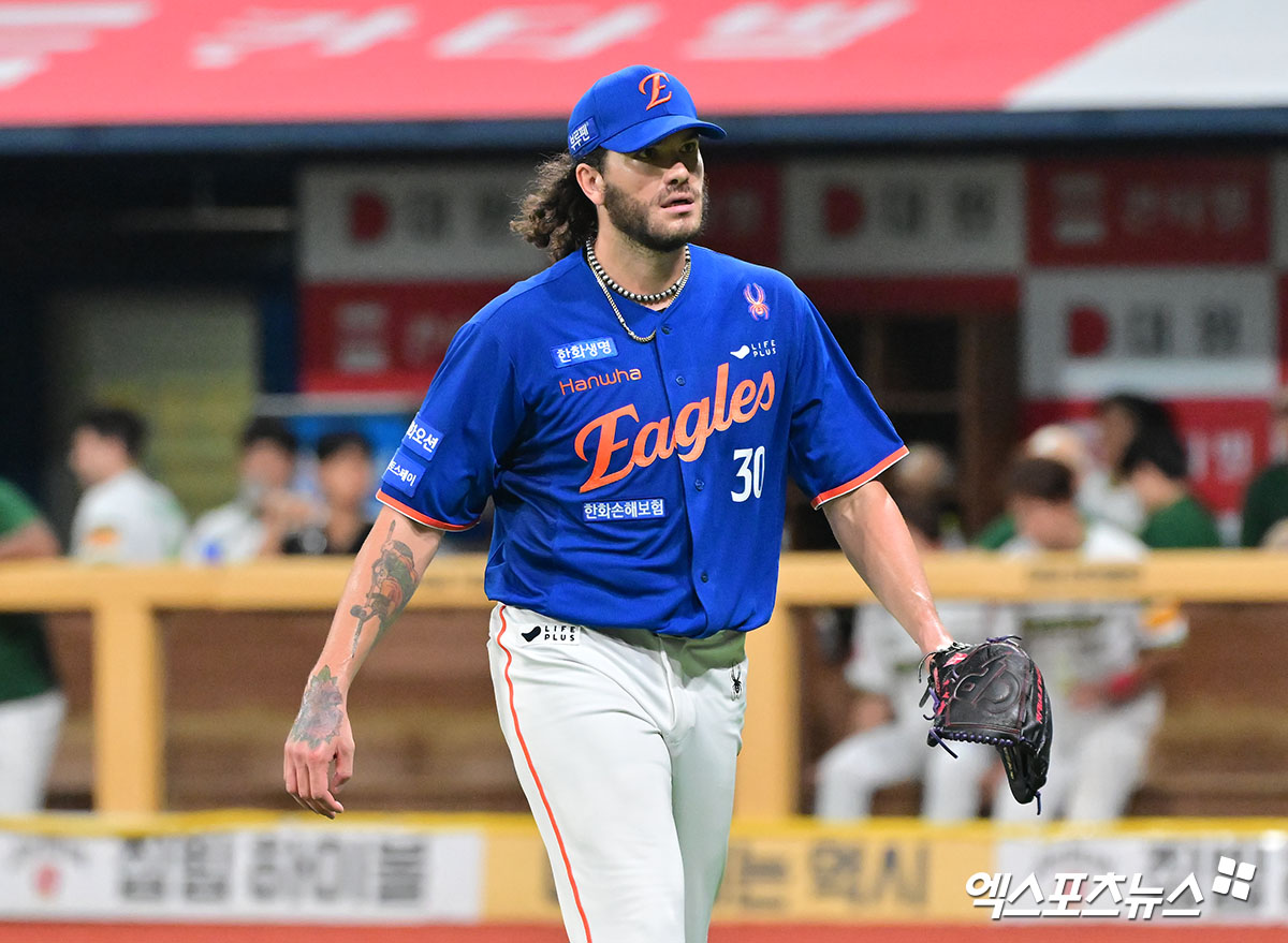 (엑스포츠뉴스 고척, 김한준 기자) 28일 오후 서울 구로구 고척스카이돔에서 열린 '2025 신한 SOL Bank KBO리그' 한화 이글스와 키움 히어로즈의 경기, 4회말 수비를 마친 한화 폰세가 포효하고 있다.