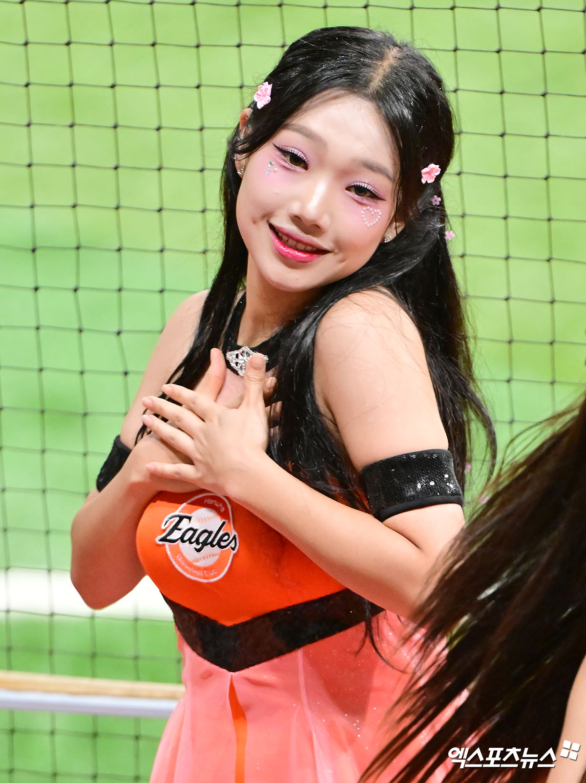 (엑스포츠뉴스 고척, 김한준 기자) 28일 오후 서울 구로구 고척스카이돔에서 열린 '2025 신한 SOL Bank KBO리그' 한화 이글스와 키움 히어로즈의 경기, 지아영 치어리더가 멋진 공연을 선보이고 있다.