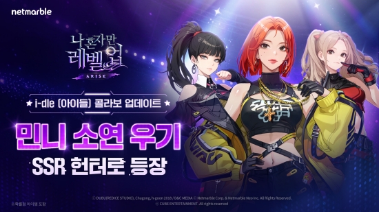 28일 넷마블(대표 김병규)은 자사 액션 게임 '나 혼자만 레벨업: 어라이즈'(개발사 넷마블네오)가 그룹 아이들과 2차 컬래버 업데이트를 적용했다고 밝혔다. 이번 업데이트를 통해 추가된 신규 SSR 헌터는 '민니', '소연', '우기'다.