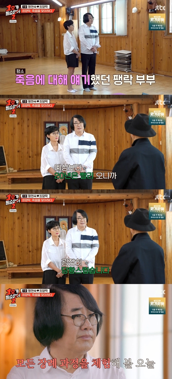 안내자는 부부에게 "오늘 팽현숙 님이 직접 최양락 씨의 장례를 손수 지낼 거다. 직접 수의도 입히고 못으로 망치도 박으면서 팽현숙 님도 같이 살아온 지난 삶을 돌아보고, 최양락 님도 인생을 돌아보게 된다"라고 설명했다.