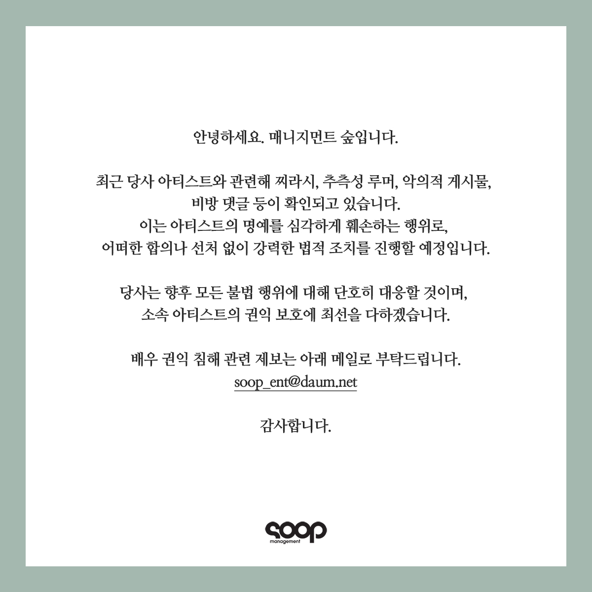 29일 수지의 소속사 매니지먼트 숲은 공식 계정을 통해 "최근 당사 아티스트와 관련해 찌라시, 추측성 루머, 악의적 게시물, 비방 댓글 등이 확인되고 있다"며 "이는 아티스트의 명예를 심각하게 훼손하는 행위로, 어떠한 합의나 선처 없이 강력한 법적 조치를 진행할 예정"이라고 전했다.