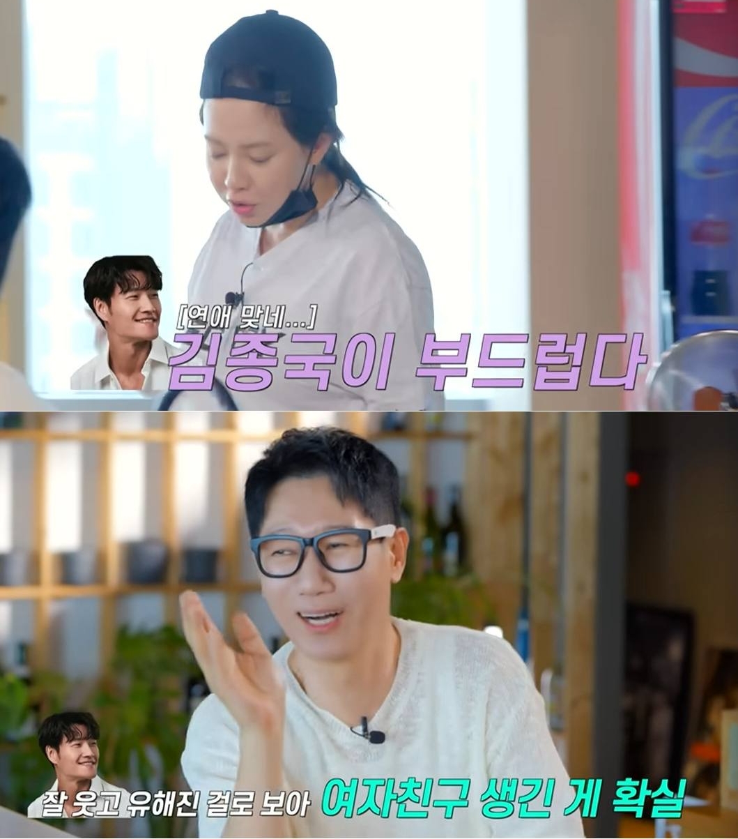 송지효의 발언도 재조명됐다. 지난해 6월 지석진의 유튜브 채널에 출연한 송지효는 김종국이 여자친구가 있는 것 같다며 "화가 많이 줄었다. 요즘에 웃음이 좀 많아졌다"고 얘기했다. 이에 지석진은 "사실 그렇게 깔깔대고 웃는 애가 아닌데"라며 공감했다.