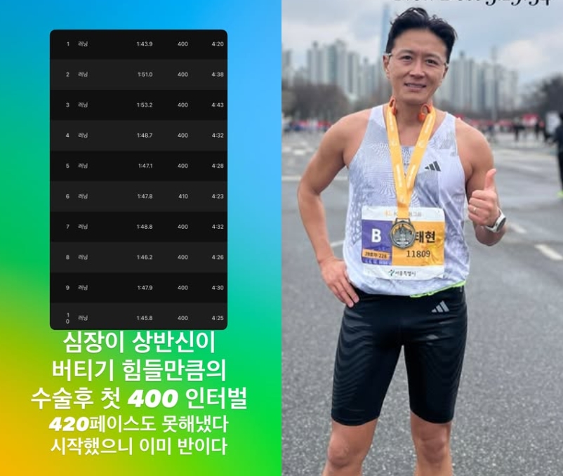 29일 진태현은 자신의 SNS 스토리에 "심장이 상반신이 버티기 힘들 만큼의 수술 후 첫 400 인터벌. 420 페이스도 못 해냈다. 시작했으니 이미 반이다"라는 글과 함께 사진 한 장을 게재했다.