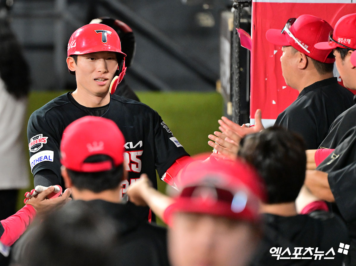 (엑스포츠뉴스 수원, 김한준 기자) 29일 오후 수원KT위즈파크에서 열린 '2025 신한 SOL Bank KBO리그' KIA 타이거즈와 KT 위즈의 경기, 8회초 무사 1루 KIA 김호령이 투런 홈런을 날린 후 더그아웃에서 하이파이브를 하고 있다.