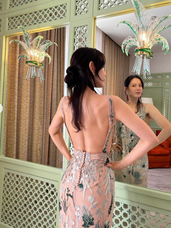 공개된 사진 속 손예진은 화려한 자수 디테일이 돋보이는 누드톤 롱드레스를 입고 거울 앞에 선 모습이다. 특히 등을 완전히 드러낸 백리스 스타일로 고혹적이면서도 우아한 매력을 뽐냈다.