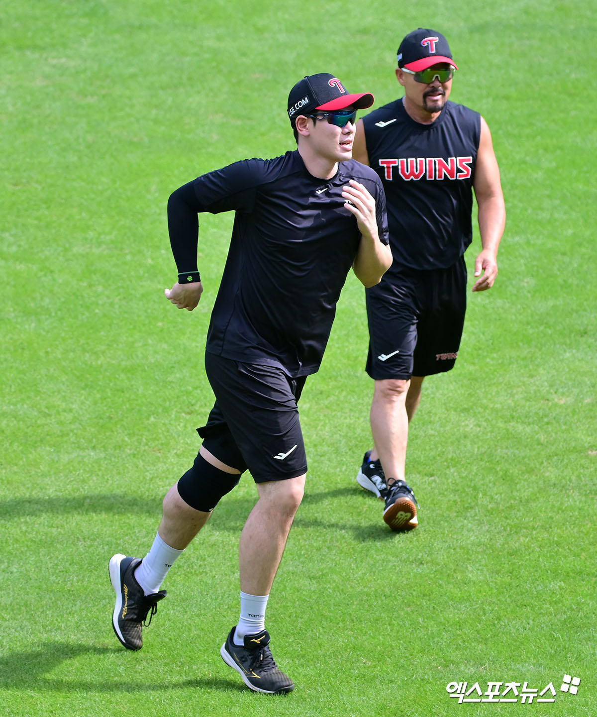 (엑스포츠뉴스 잠실, 김한준 기자) 30일 오후 서울 송파구 잠실야구장에서 열리는 '2025 신한 SOL Bank KBO리그' 키움 히어로즈와 LG 트윈스의 경기, LG 홍창기가 러닝을 하고 있다.