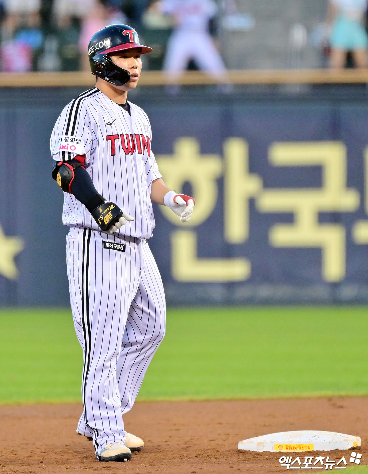 (엑스포츠뉴스 잠실, 김한준 기자) 30일 오후 서울 송파구 잠실야구장에서 열린 '2025 신한 SOL Bank KBO리그' 키움 히어로즈와 LG 트윈스의 경기, 3회말 무사 1루 LG 문성주가 2루타를 날리고 있다.
