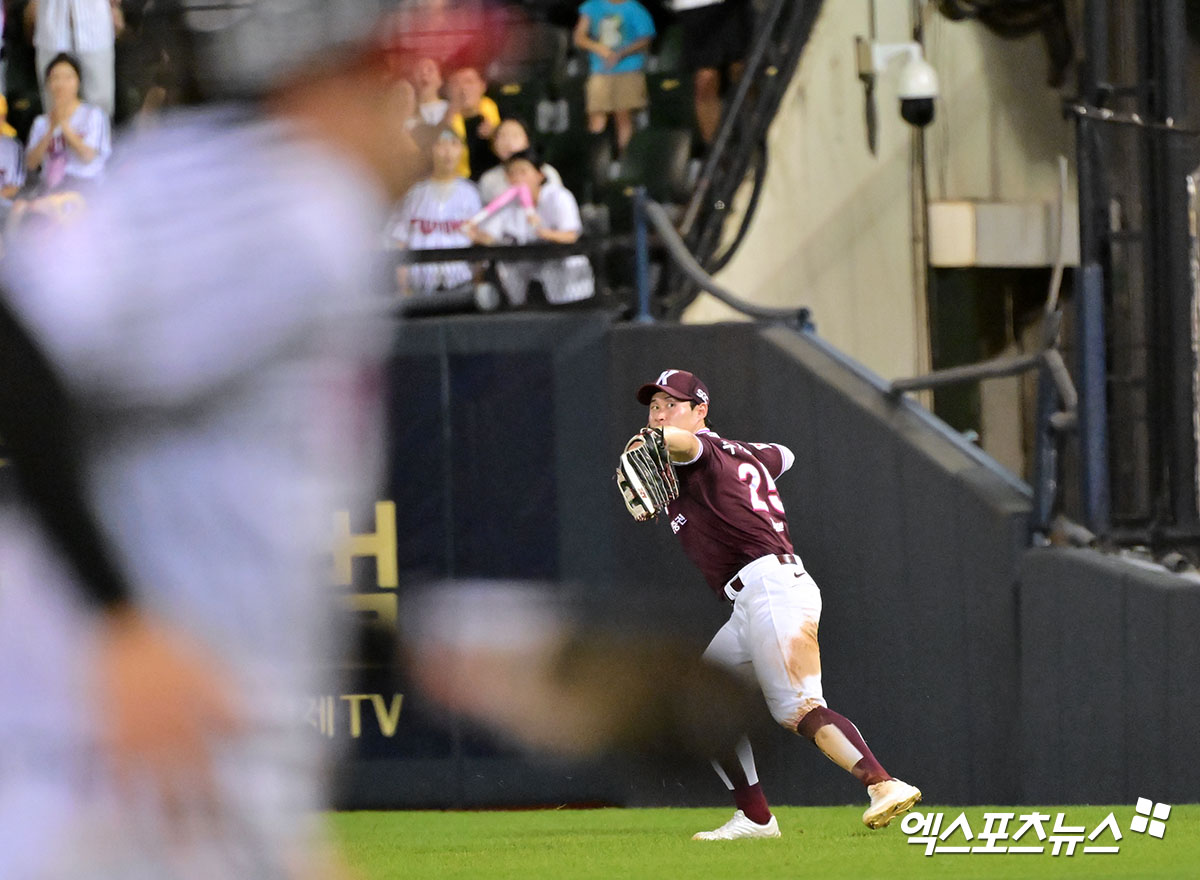 (엑스포츠뉴스 잠실, 김한준 기자) 30일 오후 서울 송파구 잠실야구장에서 열린 '2025 신한 SOL Bank KBO리그' 키움 히어로즈와 LG 트윈스의 경기, 4회말 1사 1루 키움 주성원이 LG 박해민의 타구를 잡은 후 홈으로 송구하고 있다.