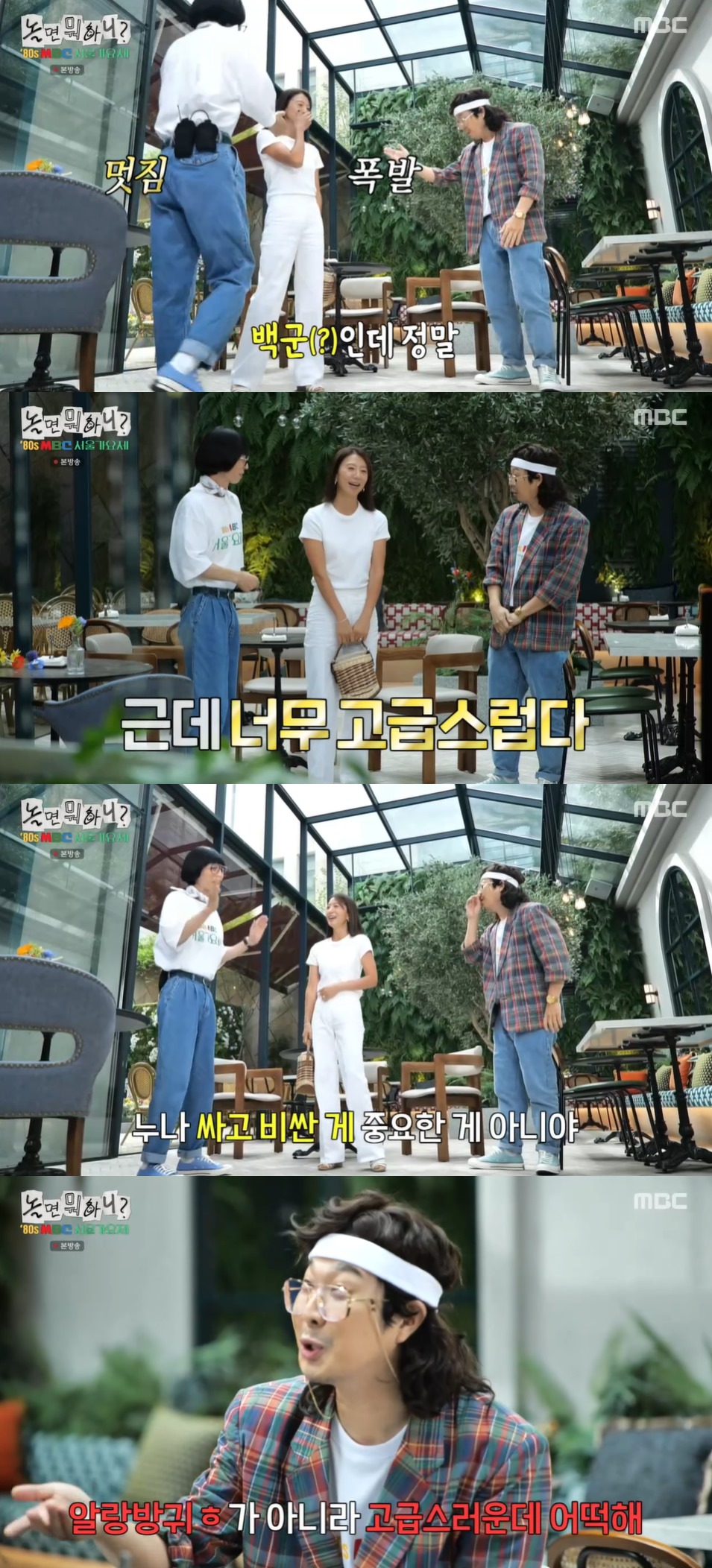 유재석은 "싸고 비싼 게 중요한게 아니다. 누나가 걸치면 고급스러워지는 거다"라고 이야기했고, 하하는 "너무 고급스러우시다"라고 거들었다.