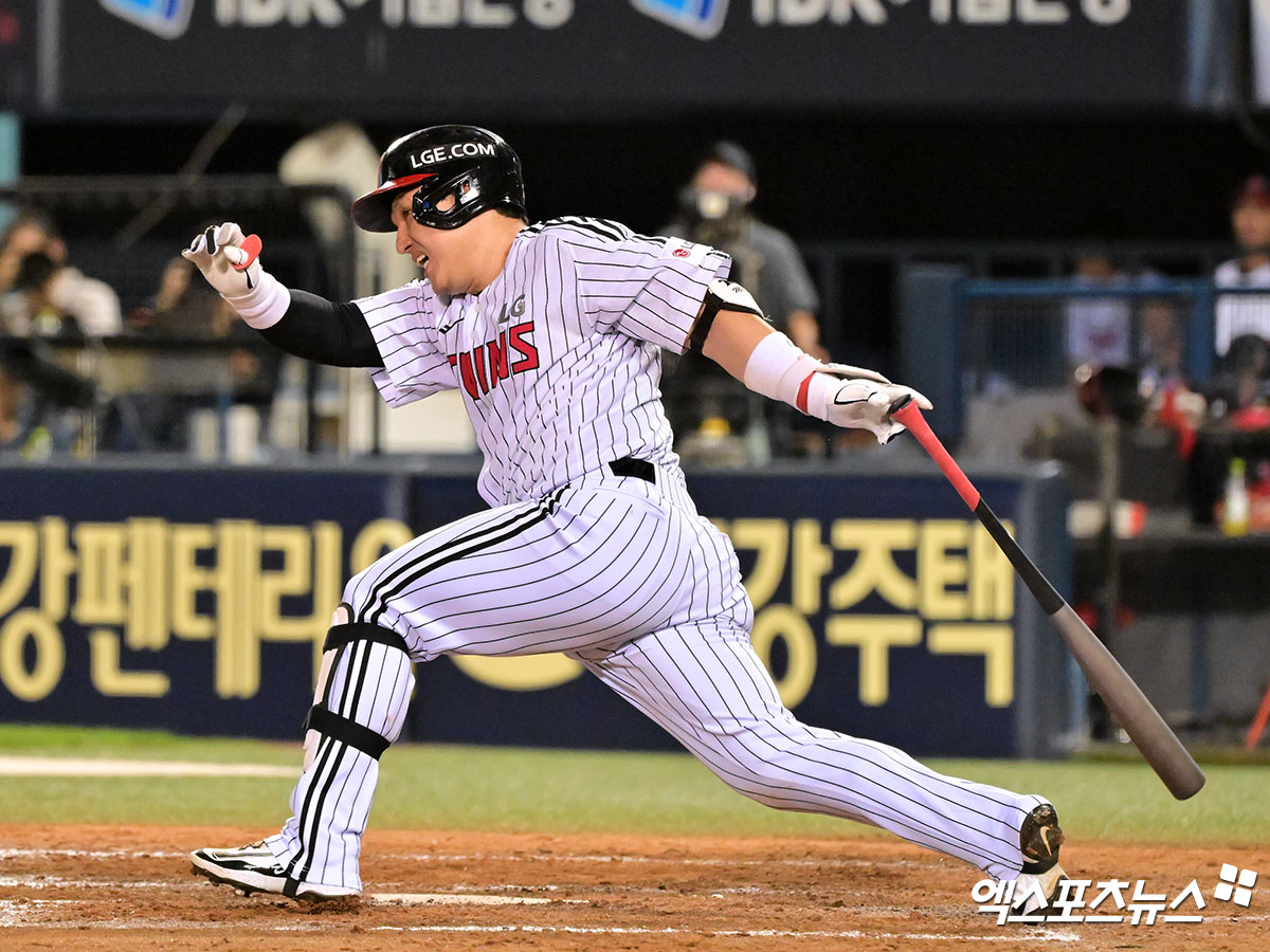 (엑스포츠뉴스 잠실, 김한준 기자) 30일 오후 서울 송파구 잠실야구장에서 열린 '2025 신한 SOL Bank KBO리그' 키움 히어로즈와 LG 트윈스의 경기, 5회말 1사 1,2루 LG 박동원이 타격을 하고 있다. 결과는 병살타 아웃.